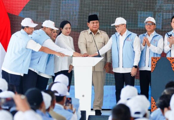 Presiden Prabowo Subianto saat sambutan pembukaan 80.081 Koperasi Desa/Kelurahan Merah Putih (KDMP/KKMP) seluruh Indonesia di Koperasi Desa Merah Putih Bentangan, Kabupaten Klaten. Mengatakan, kita harus melawan praktik-praktik yang merugikan petani dan masyararakat.