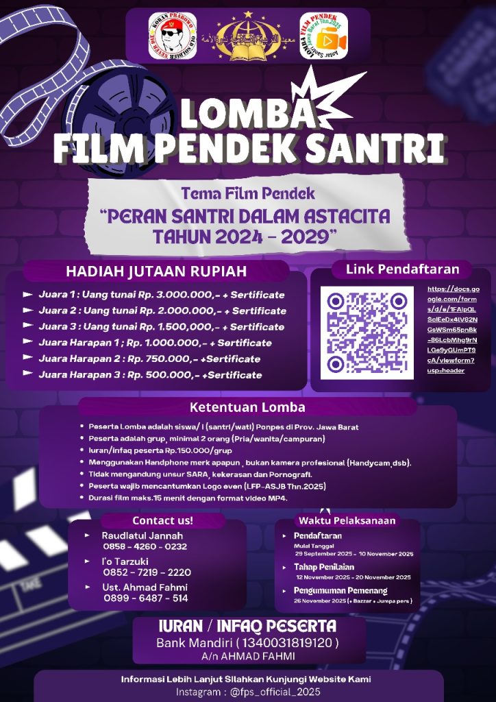 [Lomba Film Pendek Santri Jabar 2025 “PERAN SANTRI DALAM ASTACITA TAHUN 2024-2029” resmi dibuka] , Kami dari Tim Lomba Film Pendek Santri se-Jawa Barat 2025 dengan bangga mengundang kalian semua untuk bergabung dalam ajang kreatif ini!