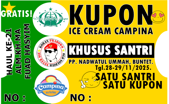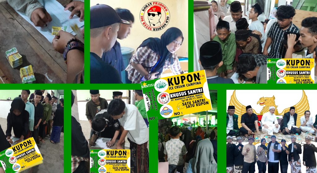 Jumat, 28/11/2025. Sejak pkl.16.00 Tim Semut Koranprabowo.id : PimRed, Sinyo – StafSus 1, A.Fahmi – Kord. Kab. Cirebon, Jupe – KorLap, dan Febri – StagSus 2. telah mempersiapkan segala sesuatu yang berkaitan dengan rencana pembagian 700 Ice Cream Campina Gratis kepada 700 santriwan/wati. Yang pastinya dibantu oleh Tim semut-nya PonPes Nadwatul Ummah – Buntet,Cirebon. Ada Aun, Rasya, Agus dsb. Checklist kerja dilakukan, sejak form isian, jumlah kupon, tekhnis distribusi dsb.