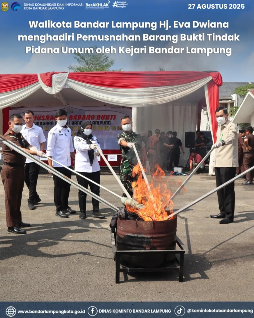 Ops, ada yang terlupa nih. Walikota Bandar Lampung, Hj. Eva Dwiana menghadiri Pemusnahan Barang Bukti Tindak Pidana Umum oleh Kejari Bandar Lampung, yang dilakukan dihalaman Dinas Lingkungan Hidup Bandar Lampung dengan cara ‘membelender’ dan membakar barang bukti hasil kejahatan tersebut.
