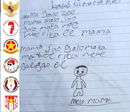 Kertas Tii Mama Reti (Surat untuk mama Reti) …. Mama Galo Zee (Mama pelit sekali)….. Mama molo Ja’o Galo mata Mae Rita ee Mama (Mama baik sudah. Kalau saya meninggal mama jangan menangis) … Mama jao Galo Mata Mae woe Rita ne’e gae ngao ee (Mama saya meninggal, jangan menangis juga jangan cari saya ee) ……. Molo Mama (Selamat tinggal mama)